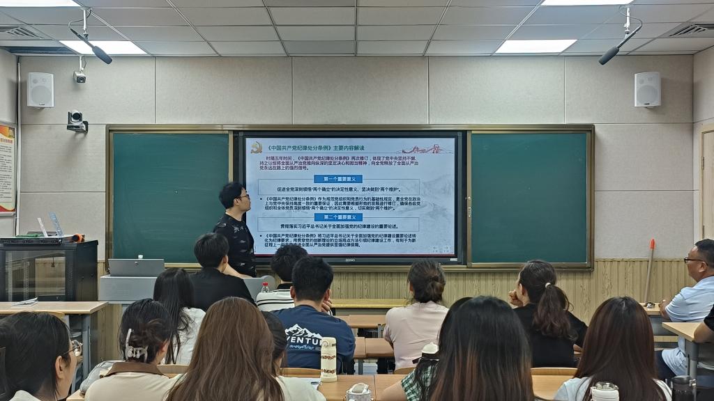 我院党委书记杨爱民为师生党员讲授了第一讲《中国共产党纪律处分条例》的制定、颁布和修订以及学习心得,第一教师党支部书记孙聘讲解了新修订《中国共产党纪律处分条例》重要意义,第二教师党支部代书记肖杨杨讲解了《中国共产党纪律处分条例》的特点和看点,第一学生党支部书记闵令珍讲解了《中国共产党纪律处分条例》总则主要内容,第二学生党支部书记崔弘讲解了《中国共产党纪律处分条例》违反政治纪律的相关处分,第三学生党支部书记颜子凡讲课题目是:认真学习贯彻《中国共产党纪律处分条例》。