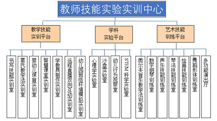教学技能实训平台拥有幼儿园班级环境模拟实训室、学教具制作实训室、婴幼儿保育实训室、蒙氏教学法实训室、书写技能实训室、远程直播双向互动实训室、智慧教室室等专业教学技能实训室,总面积达到450平米。该平台自建成以来,对本专业学生从教技能进行系统性训练,极大提升了学生的技能水平,实现了师范生培养与幼儿园一线的无缝对接。