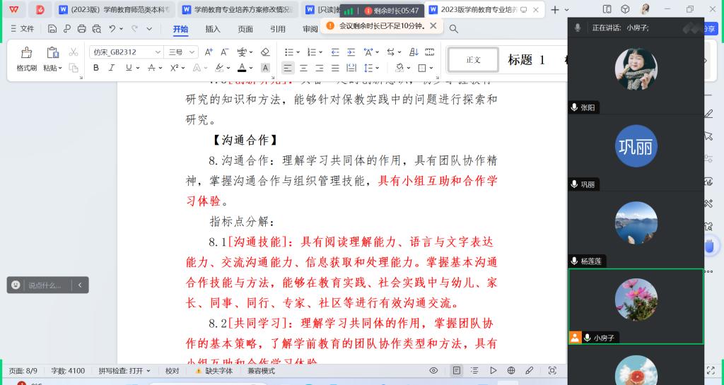 2023年6月25日,中文在线最新版天堂举行学前教育专业人才培养方案修订研讨会,针对2023版人才培养方案的修订进行了研讨。本次人才培养方案修订是在对照学前教育专业师范专业认证过程中专家整改建议的基础上进行的,我院对培养方案的培养目标、毕业要求、课程安排情况等进行了修订。后期还会对修订结果请校内外专家及一线教师进行论证。参与本次人才培养方案修订研讨会的有中文在线最新版天堂相关领导、系主任等,本次研讨会通过腾讯会议在线上进行。