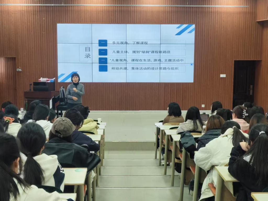 曹园长深耕幼教领域多年,对幼儿园课程建设有着丰富的实践经验和独到的见解。讲座中,她结合自身多年的教育实践,从幼儿园办园理念,“绿润”课程的理念、课程框架、儿童角色等方面进行了深入浅出的讲解,并分享了多个生动鲜活的案例,引导学生们关注儿童视角,尊重儿童发展规律,将“以儿童为本”的理念融入到未来的教育教学实践中。
