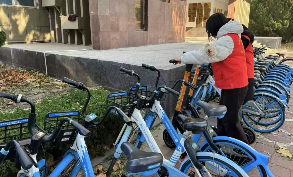 活动伊始,同学们完成分组后,迅速明确了各自职责与负责区域,便开始进行自行车整理摆放。同学们穿梭于校园各处,将横七竖八停放的自行车一一搬运至指定停车区域,排列整齐,使原本混乱的停车点变得井然有序,不仅方便了同学们的取用,也美化了校园环境。同学们还对自行车的停放进行了引导宣传,他们在校园主干道、教学楼附近等人流密集处设立“文明停车引导点”。同学们手持指示牌,友好地提醒过往同学规范停车,并为同学们详细讲解了有序停放自行车对校园交通顺畅与安全的重要性,倡导大家从小事做起,共同维护良好的校园秩序。
