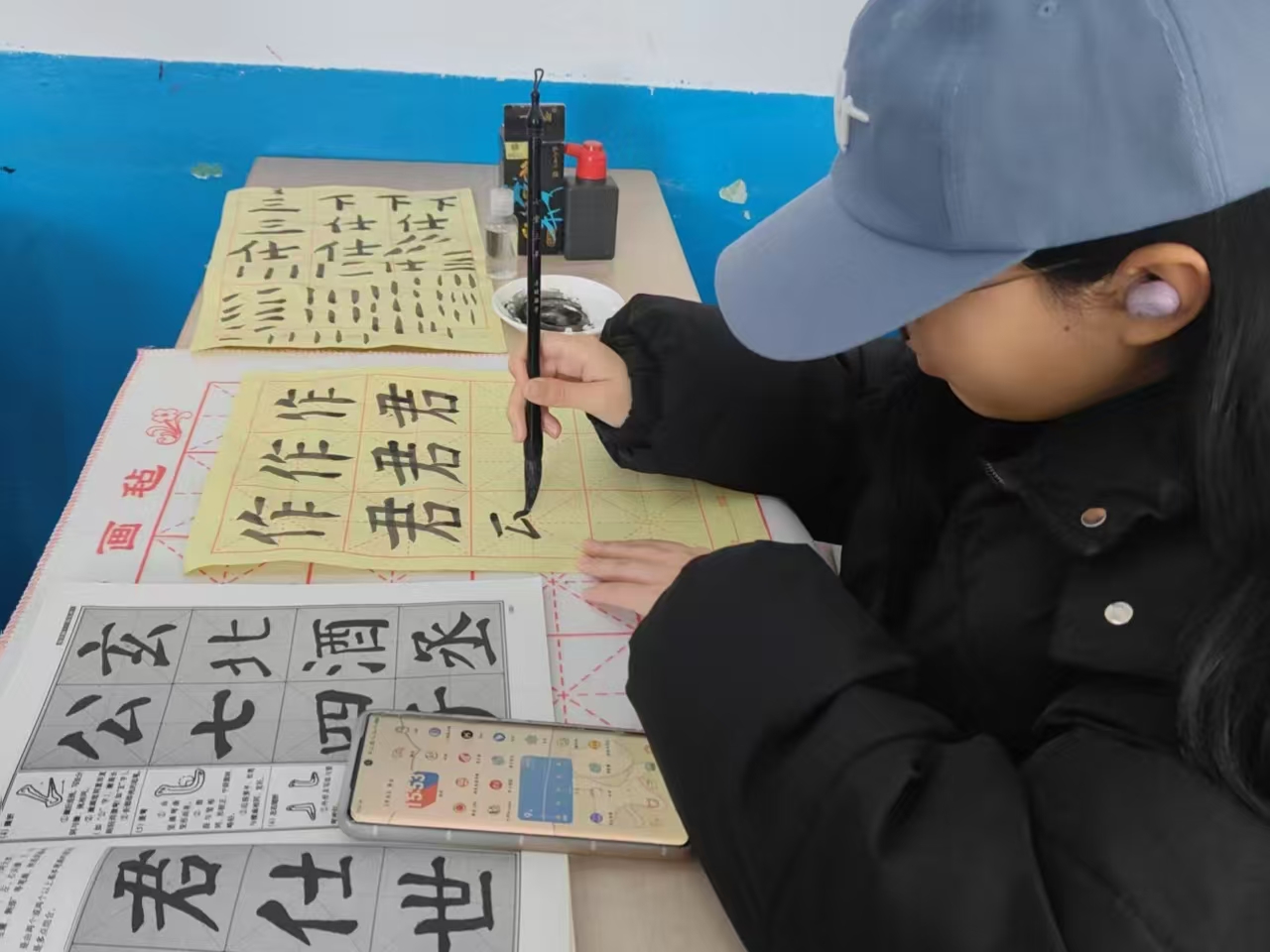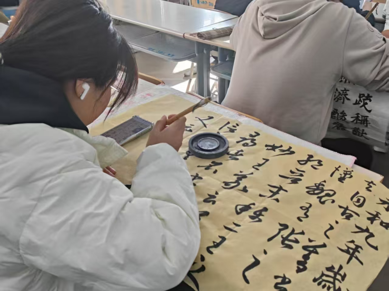 活动伊始,书画社成员首先向参加活动的同学们介绍了课桌上陈列的名家书法作品,并引导同学们欣赏了各种不同的书法风格。篆书古朴典雅,笔画规整,尽显古老文字韵味;隶书蚕头燕尾、一波三折,传递汉魏的庄重雄浑;草书笔走龙蛇、奔放不羁,抒发豪情壮志。书法作品风格多样,却都展现出书写者对汉字文化深厚的艺术造诣。欣赏过程中,同学们被不同的文化底蕴所吸引,细细品悟着笔墨韵味,对传统书画艺术也有了更深认识。在创作环节中,同学们纷纷拿起笔墨纸砚,在宣纸上挥毫泼墨,他们凝神静气,笔锋游走间,潇洒的汉字跃然纸上。