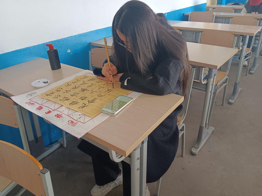 活动伊始,书画社同学带领参与活动的同学进行名家书法作品鉴赏。他们运用图片与视频资料,全方位、多维度展示多种风格的书法艺术。同学们仔细观看讲解书法演化过程的视频。这些视频资料逻辑严谨、深入浅出。其中篆书笔画风格典雅;草书则奔放不羁、笔走龙蛇,同学们沉浸其中,为书画艺术独特的魅力所折服,在欣赏过程中对书画艺术的理解也逐步加深。紧接着,实践环节有序开展。同学们纷纷执起笔墨纸砚,在宣纸上创作。他们神情专注于笔下每一笔的起笔、行笔与收笔,力求将笔法发挥到极致。在创作过程中,呈现出的字体风格各异,有的刚劲有力,展现出书写者坚定的精神气质;有的轻盈飘逸,流露出灵动的艺术美感。
