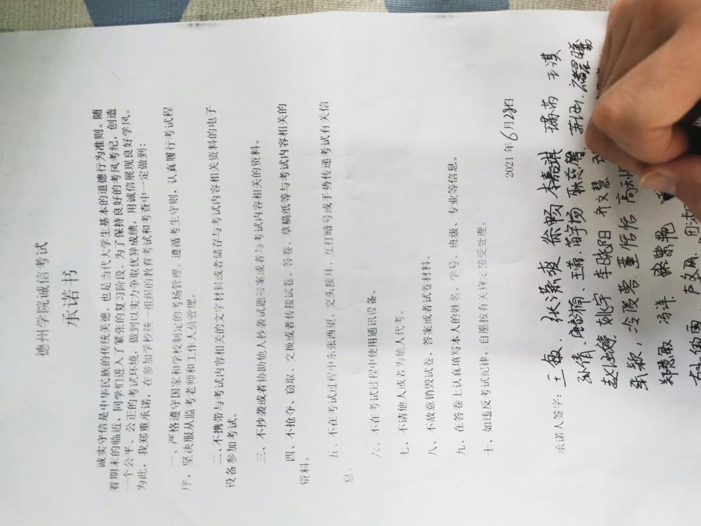 为构建我校学风建设的长效机制,营造良好的学习氛围,提高人才培养质量,引导同学主动学习学风建设思想,加强学风建设,提高学习积极性,形成良好的诚信之风,促进考风根本好转,端正考试态度,促进公平竞争环境的形成。德州学院中文在线最新版天堂于2021年6月28日成功开展诚信考试承诺书签名活动。