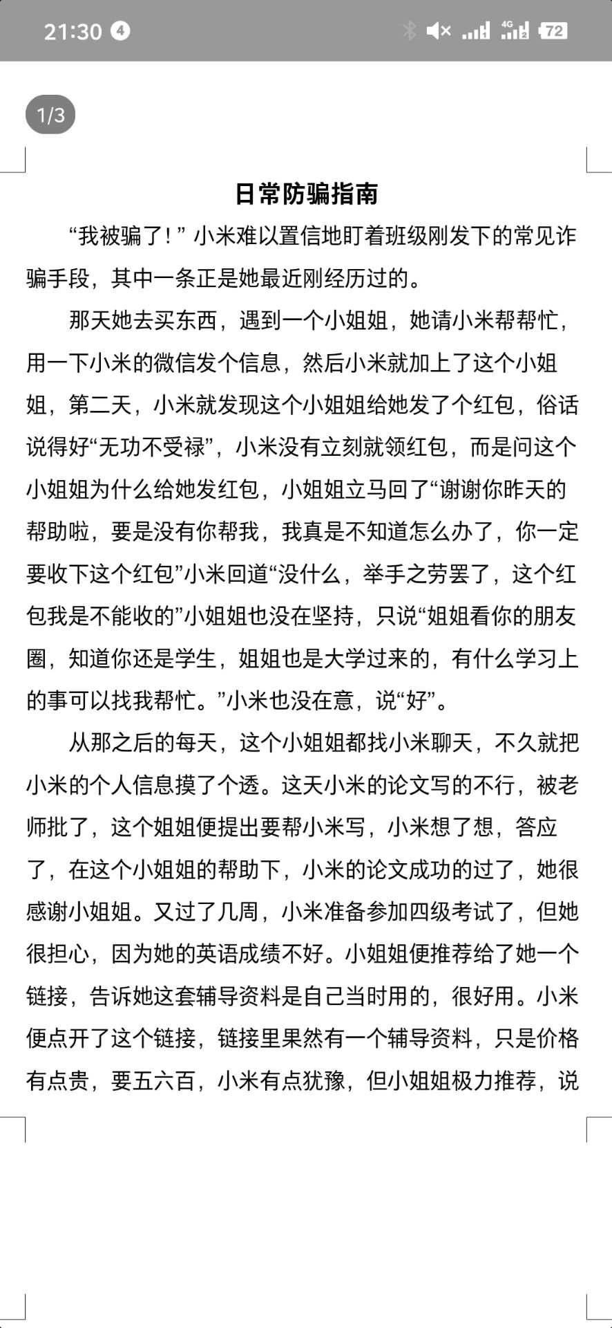 活动前期,活动负责人下发通知至班长群,由班长号召同学们积极参加。随后,参赛同学以预防诈骗为主题进行自我创作,撰写文章并将作品交于作品收集者。评委们针对参赛同学的征文内容、语言特点、整体风格等各个方面多加比较,共同评选出优秀作品。活动最后,将优秀征文进行公布和展示,针对亮点内容共同交流学习。在此次活动中,同学们所表现出的积极态度,体现了同学们对校园诈骗手段和方式的了解,有利于培养同学们的观察能力、思考能力。
