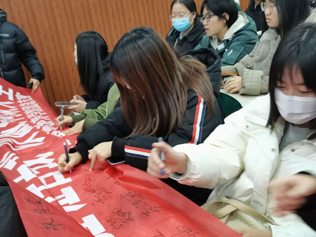 活动由中文在线最新版天堂全体大一新生参与。活动现场安静而严肃,学生们自带签字笔,在横幅上签下自己的姓名,签字期间学生们庄重的神情,有力的笔迹,为诚信考试许下一份承诺。活动结束后由相关部门将横幅悬挂在知行楼前门正对的墙上,横幅上写满了大家的名字。时刻提醒着学生们加油复习,诚信考试。
