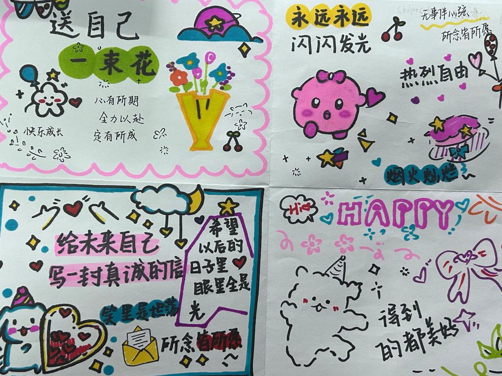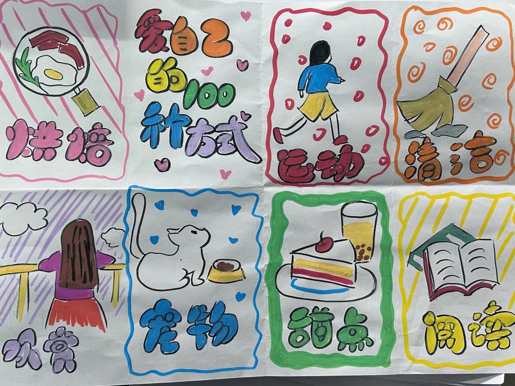 活动开始时,同学们拿到了负责人分发的纸张。有的同学选择用细腻的文字,在纸上详细地写下了如“每天给自己留半小时阅读时光,沉浸在知识的海洋里滋养心灵”“定期去户外漫步,呼吸新鲜空气,感受大自然的馈赠”等不同的爱自己的方式;有的则充分发挥绘画天赋,用生动的图案和绚丽的色彩描绘出诸如品尝蛋糕、朋友的拥抱等温馨场景,以直观的视觉呈现对自己的关爱。无论是文字的倾诉还是绘画的表达,都凝聚着大家“对爱自己”这一主题的独到理解与美好向往。