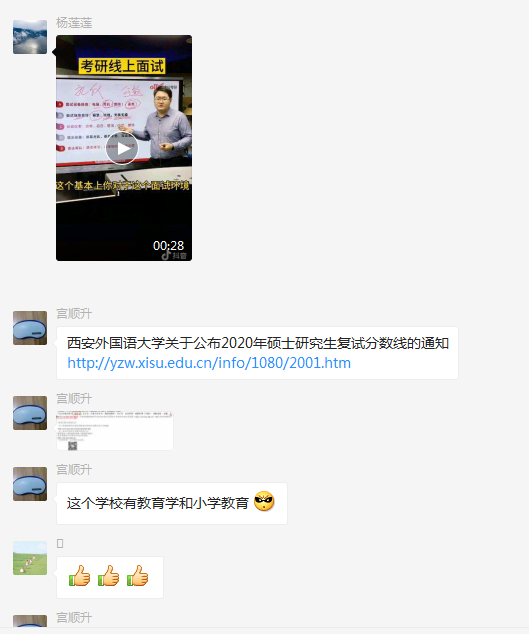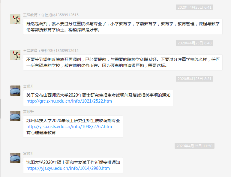 对于考研复试调剂,建有两个微信群,首先是“教科院考研调剂群20届”,由全体过线学生与班子成员、辅导教师组成,发布调剂复试相关信息,目前几乎发布了所有教育学类复试与调剂的相关信息,共计43所院校,师生共同研判,遇到问题及时研讨,调整对策。其次,“考研上线辅导教师交流群”,由全体辅导教师组成,实施一天一调度,填写“上线学生复试调剂一对一的个性化方案”确保工作尽可能落实到位。同时,也为辅导教师之间交流与学习提供了新形式。再次,对过线学生进行了“分类”,能进入复试者、能进入复试有调剂可能者、调剂者、拒绝调剂者等。根据不同的类别分别实施相应的策略。