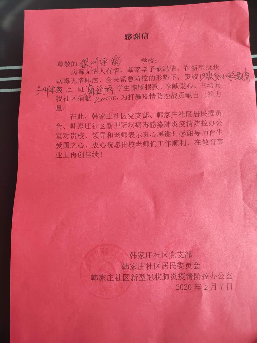 我院2019级小学教育专升本2班韩亚丽同学慷慨捐款、奉献爱心,向社区捐献200元,为打赢疫情防控战贡献自己的力量,受到韩家庄社区党支部、韩家庄社区居民委员会、韩家庄社区新型冠状病毒感染肺炎疫情防控办公室的书面表扬。