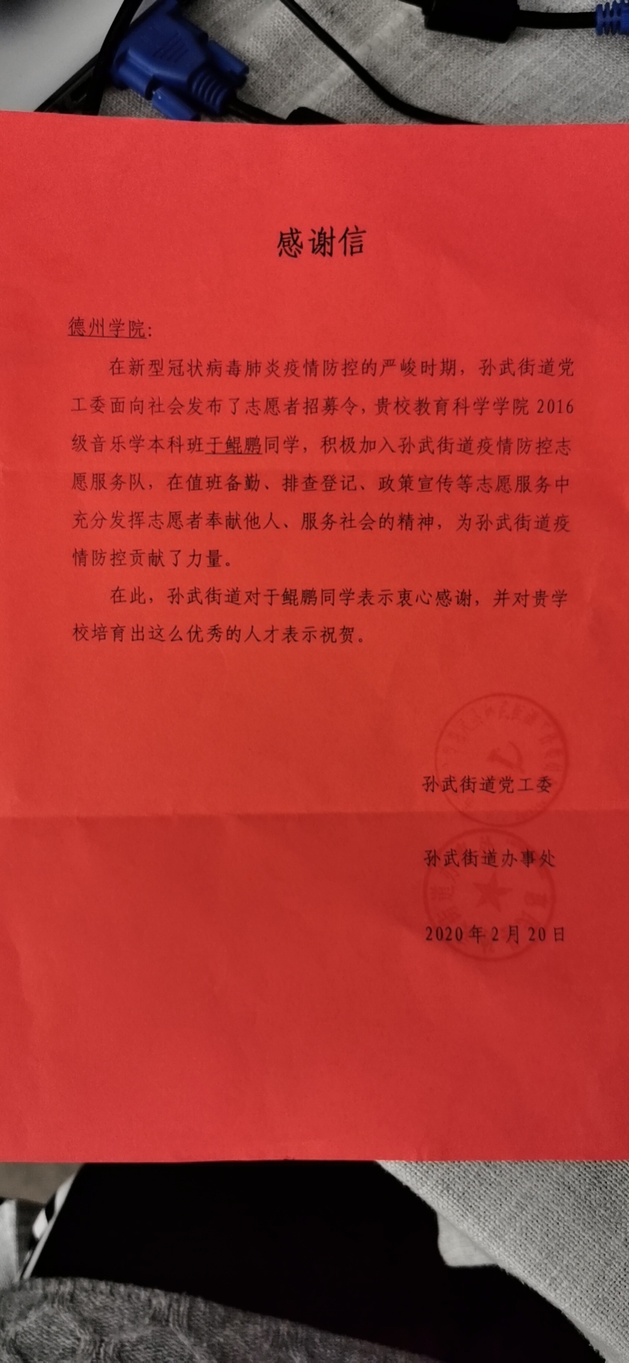 我院2016级音乐学本科班于鲲鹏同学,积极加入孙武街道疫情防控愿服务队,在值班备勤、排查登记、政策宣传等志愿服务中充分发挥志愿者奉献他人、服务社会的精神,为孙武街道疫情防控贡献了力量,受到孙武街道党工委、孙武街道办事处的书面表扬。