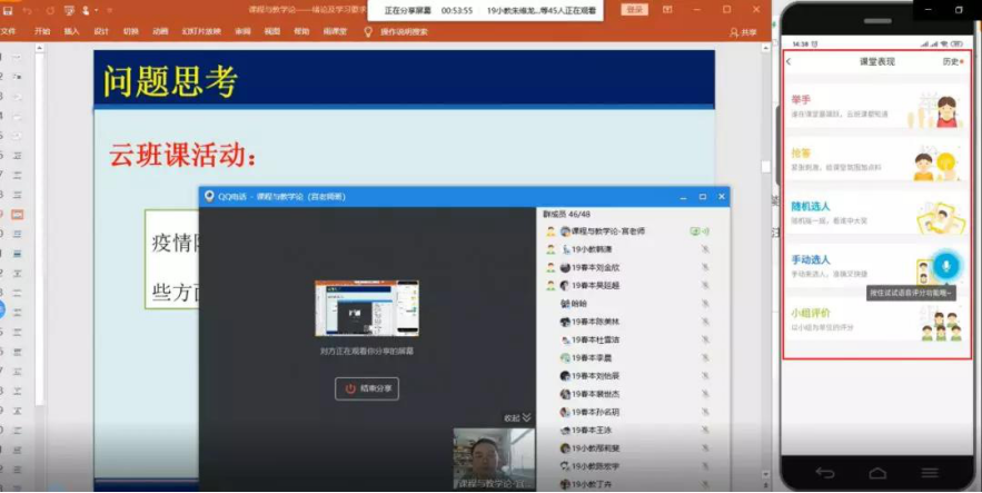 云班课是该老师使用了2年多的教学互动平台。课程的线上资源和活动设计都已经在云班课中了。而学生的课前自主学习、课堂互动及记录、课后作业、单元测试,都依靠云班课平台完成。另外,为了增加透明感,让学生明晰在云班课教师端的操作,又进行了手机电脑同屏;为了预防网络崩溃,我在自己的笔记本电脑上同步录屏,以作为最兜底的方案。